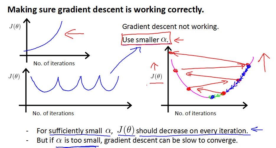 下图显示了,梯度下降算法是否正常工作,这和学习率有很大关系,如果学习率较大的话,很可能会越过代价函数局部最小点,变得发散: