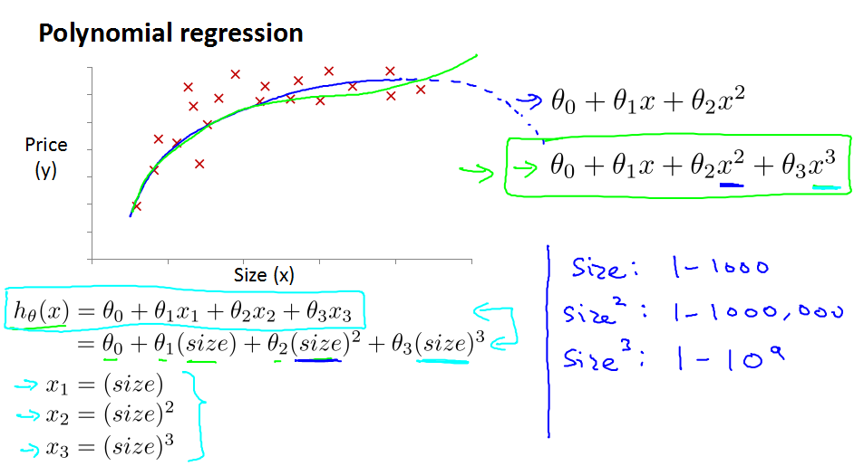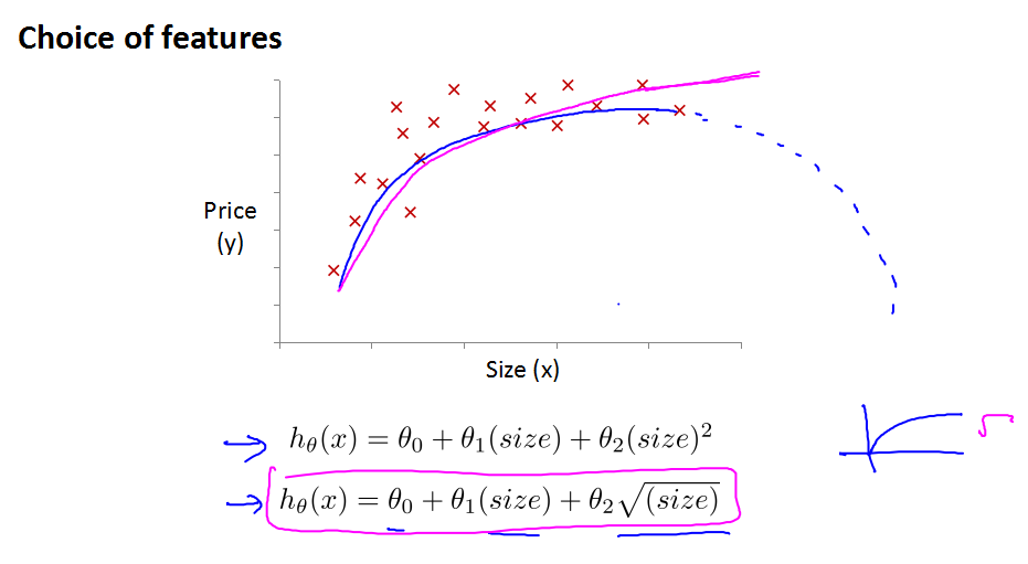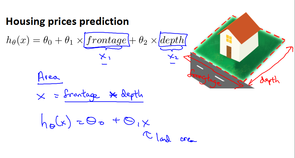 再来看之前我们的房价预测的例子,预测模型与长宽有关,但其实也跟面积有关,我们可以得到一个新的预测模型,这里进行了特征的重新整合。