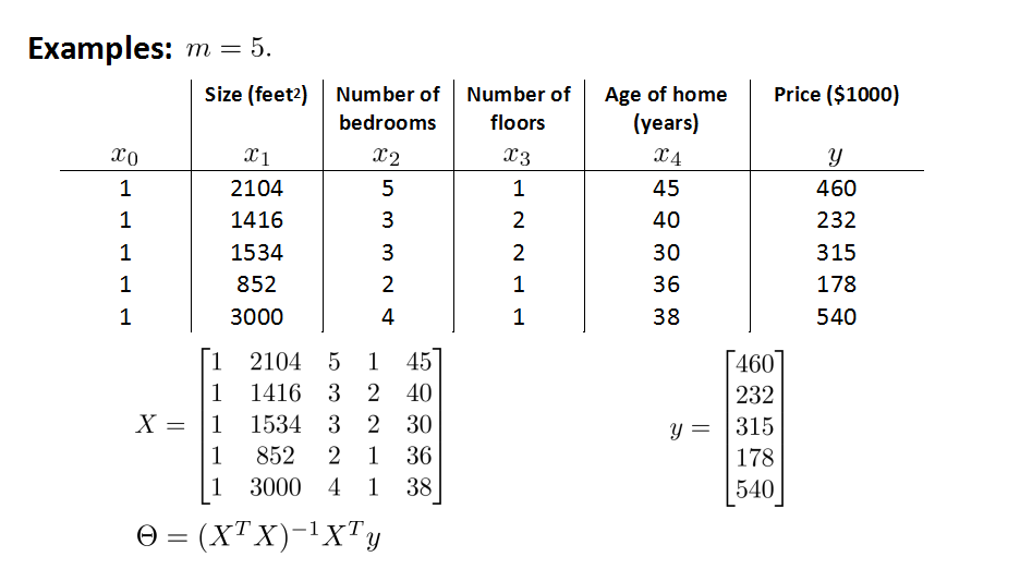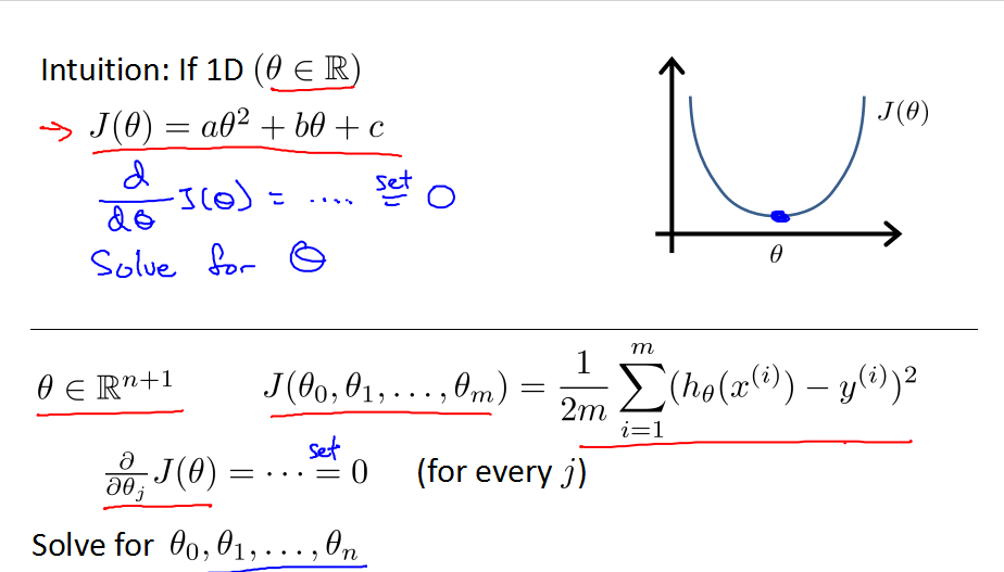 前面我们使用梯度下降算法求参数,但我们也可以使用正规方程来求参数。下面显示了我们可以直接令偏导数为零来求参数这类似与求极值点。