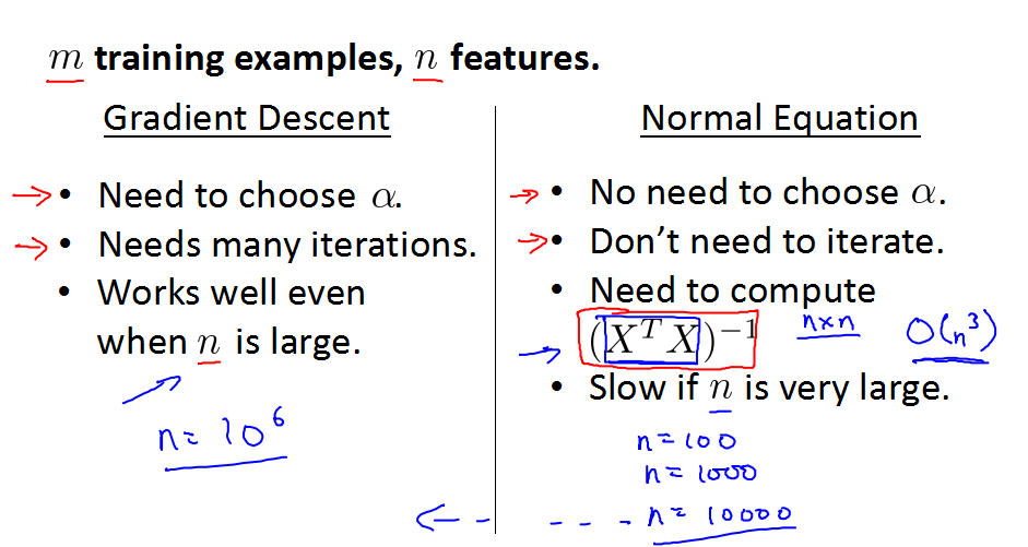 下面来比较一下梯度下降和正规方程之间的优缺点,这和特征数量大小有很强的的关系。