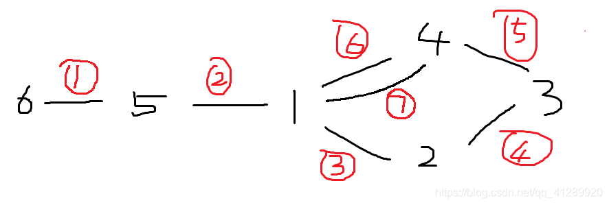首先很显然5,1是割点,6->5->1->2->3->4了之后把这六条边全都压栈,然后回溯到1的时候发现1是割点,记录一下,并且③④⑤⑥全部出栈,然后再走1-4这条边,就直接进入else压栈了(也就是这一步错了,因为本身不该压栈的)。然后回溯回5,发现5是割点(因为low[1]>=dfn[5]成立,说明5是割点!不要认为说明1是割点!你要知道你遍历的时候是5是父节点1是子节点!),然后记录一下,②⑥出栈(这时候⑥又被计算了一次。要知道虽然是点双,所以每个顶点可能被计算多次,但是每条边依旧是只能被计算一次!所以被计算两次就是个错误,更何况5号点和⑥号边,半毛钱关系都没有,隔着老远咧。)