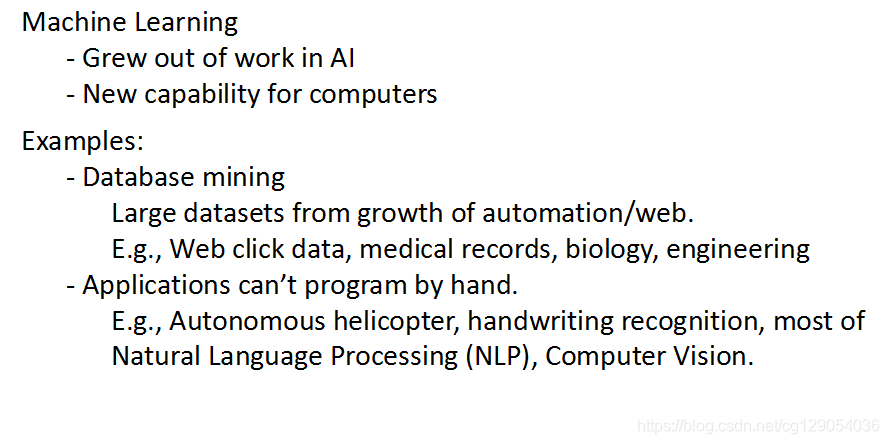 第一个视频主要介绍了机器学习目前的案例,主要有:数据库挖掘、医疗记录、生物工程、无人直升机、手写识别、NLP、计算机视觉等。
