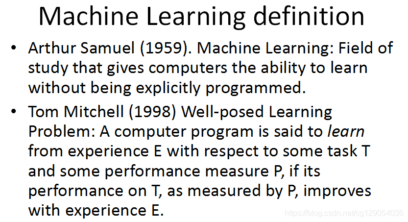 下面是机器学习的两个定义,分别来自于Arthur Samuel 和 Tom Mitchell:
