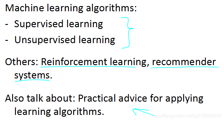 目前存在几种不同类型的学习算法,主要的两种类型为监督学习和无监督学习。此外还有强化学习和推荐系统等。但更重要的还有了解应用学习算法的建议。我们不仅要知道工具,更要知道如何使用好工具。