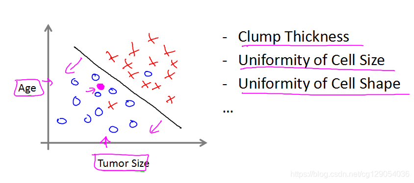 在其它机器学习问题中,可能会遇到不止一种特征,我们不仅知道肿瘤的尺寸,还知道患者的年龄。肿块密度、肿瘤细胞尺寸等等。