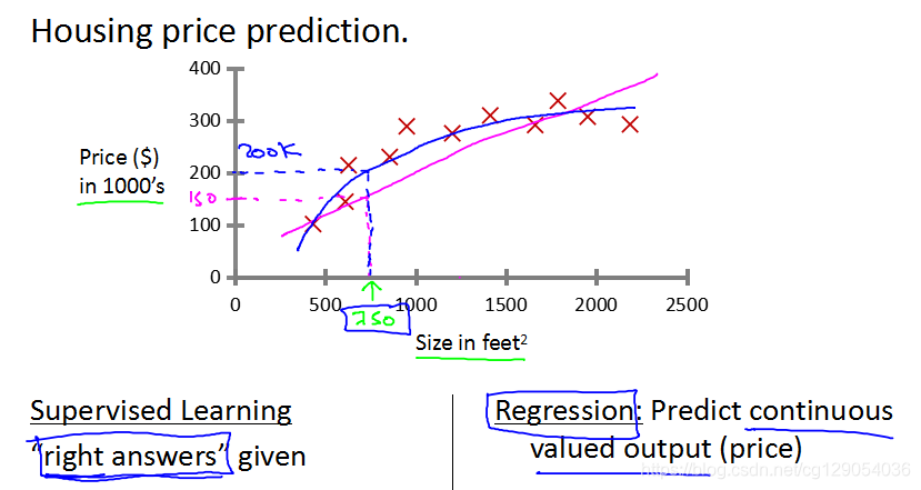 先看一个例子,这有一张数据图,横轴表示面积,纵轴表示房价。基于这组数据,假如你有一个朋友,他有一套750平方英尺的房子,能卖多少钱?从图中可以看出,红色和蓝色曲线代表两种拟合方式,显然蓝色曲线拟合的效果更好。这是一个回归问题,回归的意思是,我们在试着推测出一个连续值的结果。