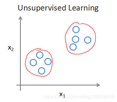 现在我们来介绍无监督学习。在监督学习中,数据集已经有了正确的标记。而在无监督学习中,数据集没有任何的标签。下图中,我们把数据分成了两个簇,这是聚类算法。