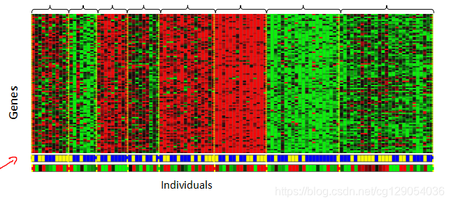 下图也是一个聚类算法的应用,输入一组不同个体的基因,我们把个体聚类到不同的类或不同类型的组。