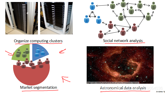 下面是无监督学习的应用,如组织大型计算机群、社交网络分析,市场分割,天文学数据分析。