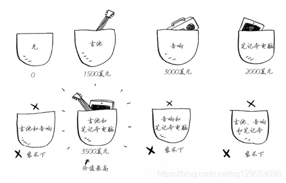 我们再看第八章的背包问题,假设你是个小偷,为了让盗窃的商品价值最高,你该选择哪些商品?最简单的算法如下:尝试各种可能的商品组合,并找出价值最高的组合。