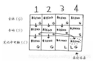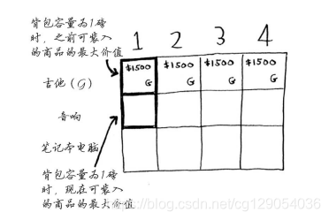 下面来开始填充网格,第一个单元格表示背包的容量为1磅,吉他的重量是1磅,这意味着它能装入背包!因此这个单元格包含吉他,价值为1500美元。