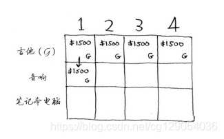 你现在位于第二行,可偷的商品有吉他和音响。在每一行,可偷的商品都为当前行的商品以及之前各行的商品。因此,当前你只能偷音响和吉他。我们来看第一个单元格。