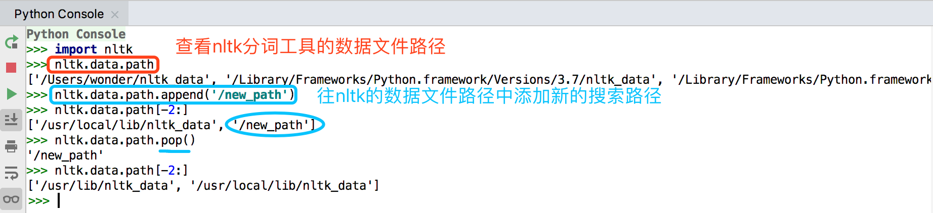 2.4 最后把nltk_data目录以代码的形式添加到nltk的数据文件路径中(只需要在第一次安装时添加,添加的代码如下)。