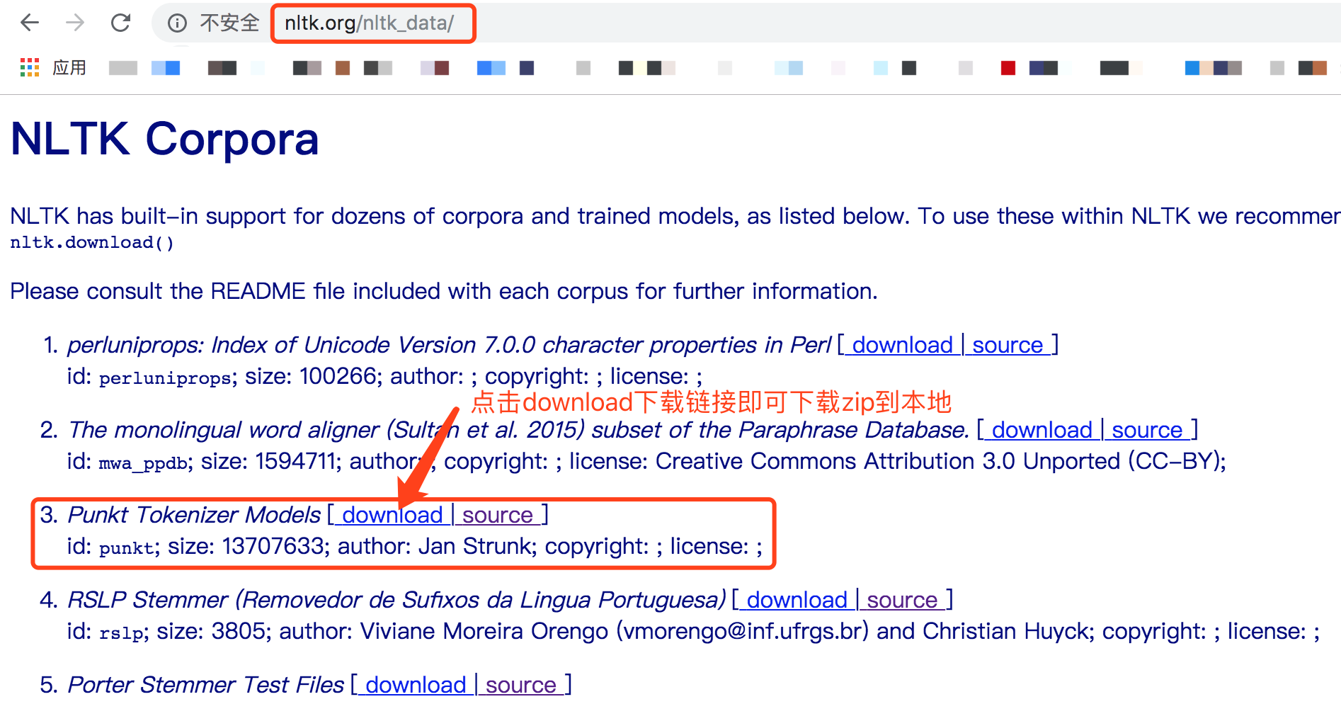 2.1 先到官网NLTK Corpora(如下图)下载zip包: