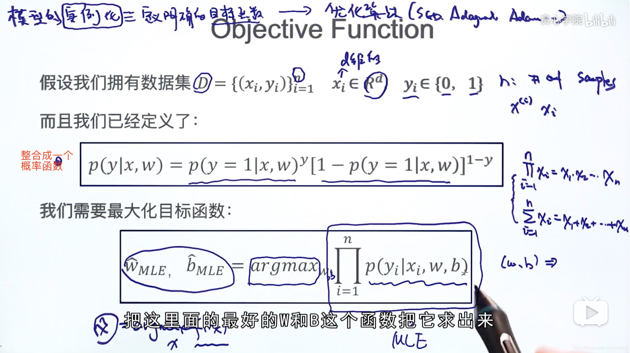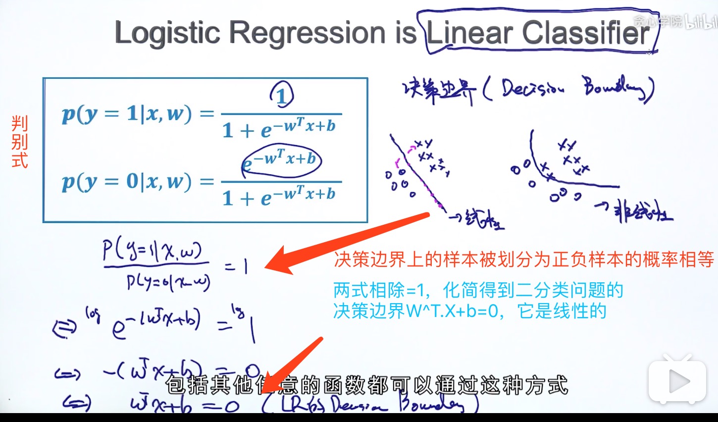 决策边界的由来:决策边界上的样本被划分为正负样本的概率相等,即P(y=1|x,w) = P(y=0|x,w)得到。