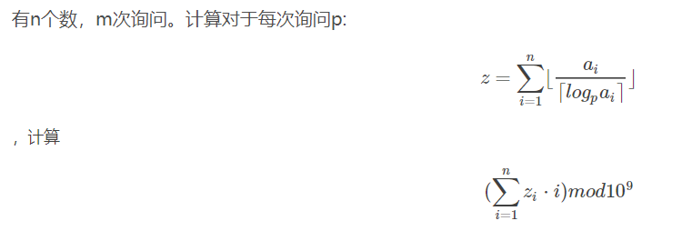int main() {int t;cin>>t;while(t--) {int n,m;scanf("%d%d",&n,&m);for(int i=1; i<=n; i++) {scanf("%lld",&a[i]);}sort(a+1,a+n+1);for(int j = 1; j<=30; j++) {for(int i=1; i<=n; i++) {all[i][j]=all[i-1][j]+a[i]/j;}}ll ans=0;for(ll i=1; i<=m; i++) {ll tmp=0;scanf("%lld",&p[i]);for(ll j=1; j<=n;) {int ff=0;ll tt=(ll)ceil(log(a[j]*1.0)*1.0/log(p[i]*1.0));//求出大分母 ll maxx=qsm(p[i],tt,ff);if(ff) {ll sum1=all[n][tt]-all[j-1][tt];tmp=(tmp+sum1)%mod;break;}int pos=upper_bound(a+1,a+n+1,maxx)-a - 1; //找到最后一个小于等于他的。 ll sum=all[pos][tt]-all[j-1][tt];tmp=(tmp+sum)%mod;j=pos+1;}ans=(ans+i*tmp)%mod;}printf("%lld\n",ans%mod);}return 0;