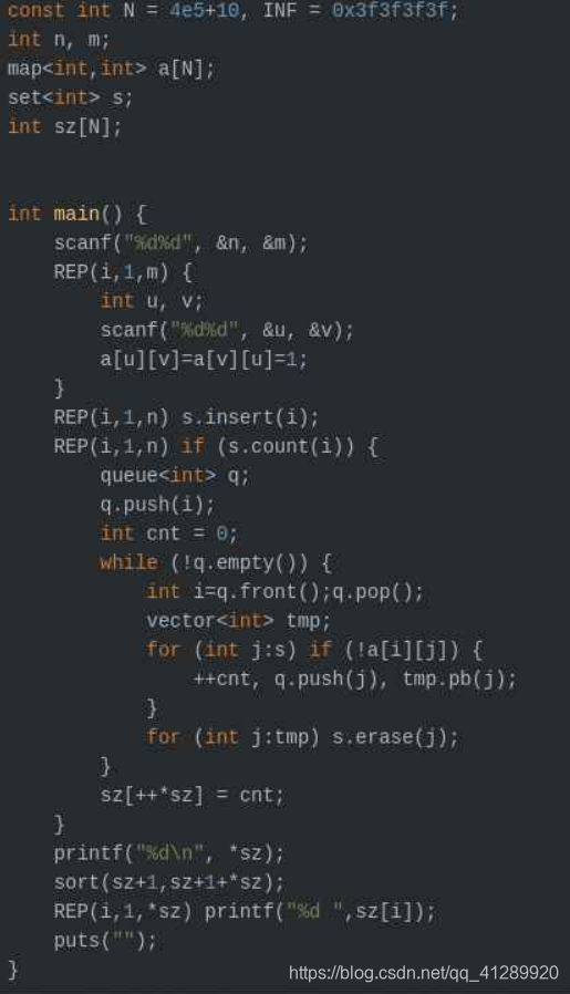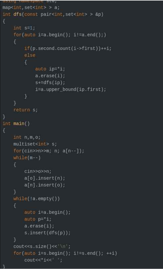 void Bfs(int x) {tot++;ans[tot]=1;st.erase(x);queue<int>s;s.push(x);while(!s.empty()) {int u=s.front();s.pop();int cnt=0;for(set<int>::iterator it=st.begin(); it!=st.end(); it++) {int to=*it;if(binary_search(mp[u].begin(),mp[u].end(),to) == 0) {s.push(to);ans[tot]++;del[++cnt]=to;}}for(int i=1; i<=cnt; i++)st.erase(del[i]);}