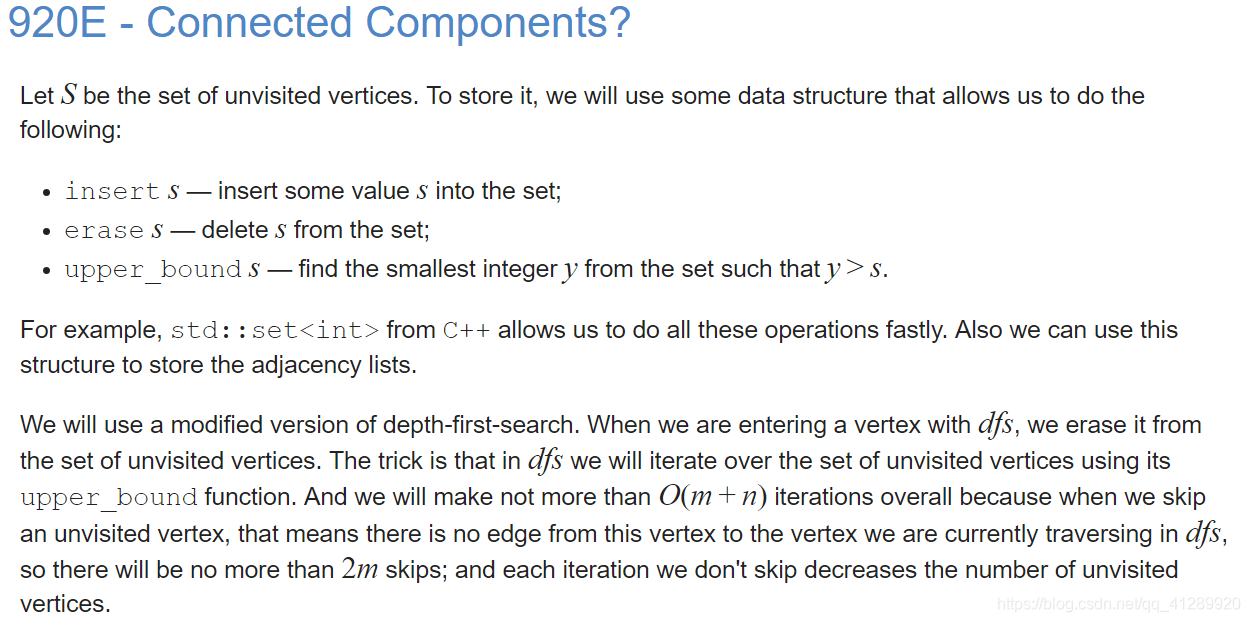 用set维护未被访问的点集,bfs中对于每一个点,先一遍操作,同时记录一个vector,然后再更新到set中(删除元素),这样避免了边操作边更新所带来的迭代器的变化,避免了 不好控制 的情况发生。
