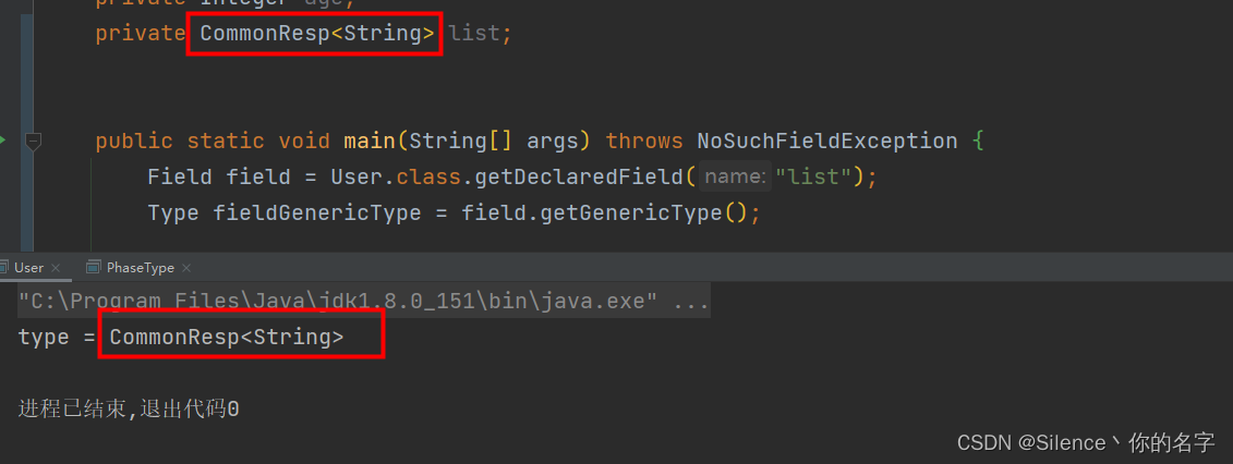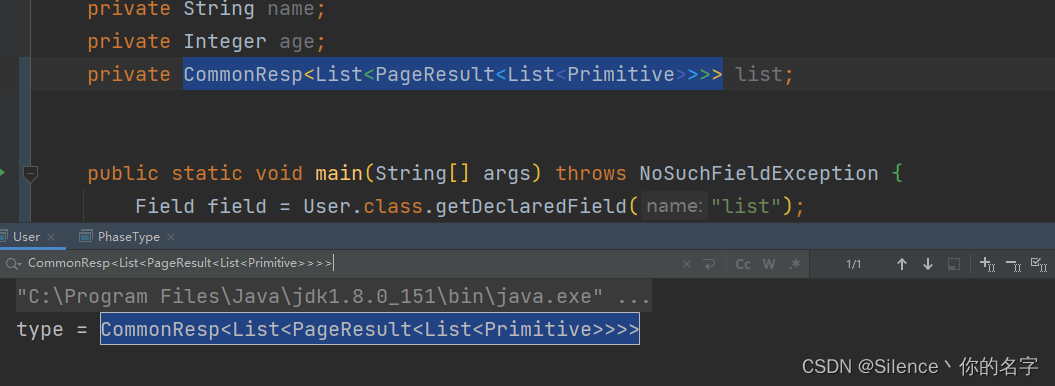 public static void main(String[] args) throws NoSuchFieldException {Field field = User.class.getDeclaredField("list");Type fieldGenericType = field.getGenericType();ArrayList<Class<?>> list = new ArrayList<>();ClasUtil.getAllParameter(fieldGenericType, list);StringBuilder param = new StringBuilder();for (int i = 0; i < list.size(); i++) {String simpleName = list.get(i).getSimpleName();if (i >= 1) {param.append("<");}param.append(simpleName);}for (int i = list.size() - 1; i > 0; i--) {param.append(">");}System.out.println("type = " + param.toString());}