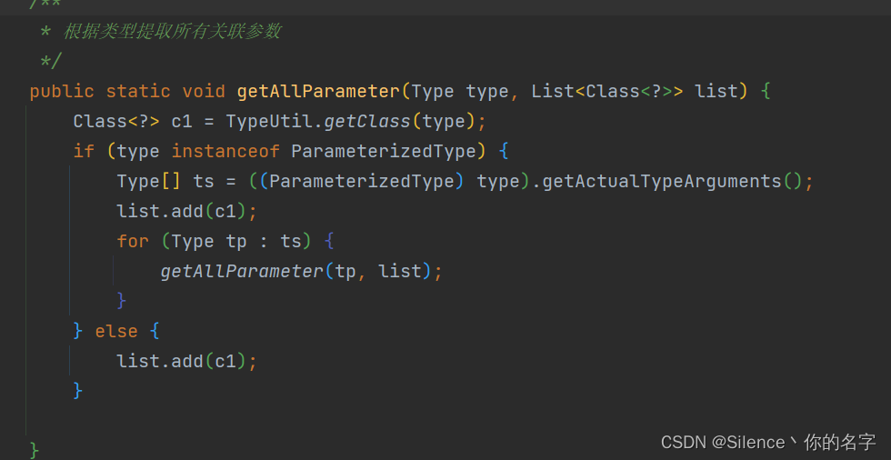 /*** 根据类型提取所有关联参数*/public static void getAllParameter(Type type, List<Class<?>> list) {Class<?> c1 = TypeUtil.getClass(type);if (type instanceof ParameterizedType) {Type[] ts = ((ParameterizedType) type).getActualTypeArguments();list.add(c1);for (Type tp : ts) {getAllParameter(tp, list);}} else {list.add(c1);}}