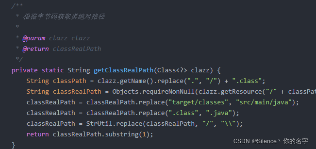 /*** 根据字节码获取类绝对路径** @param clazz clazz* @return classRealPath*/private static String getClassRealPath(Class<?> clazz) {String classPath = clazz.getName().replace(".", "/") + ".class";String classRealPath = Objects.requireNonNull(clazz.getResource("/" + classPath)).getPath();classRealPath = classRealPath.replace("target/classes", "src/main/java");classRealPath = classRealPath.replace(".class", ".java");classRealPath = StrUtil.replace(classRealPath, "/", "\\");return classRealPath.substring(1);}