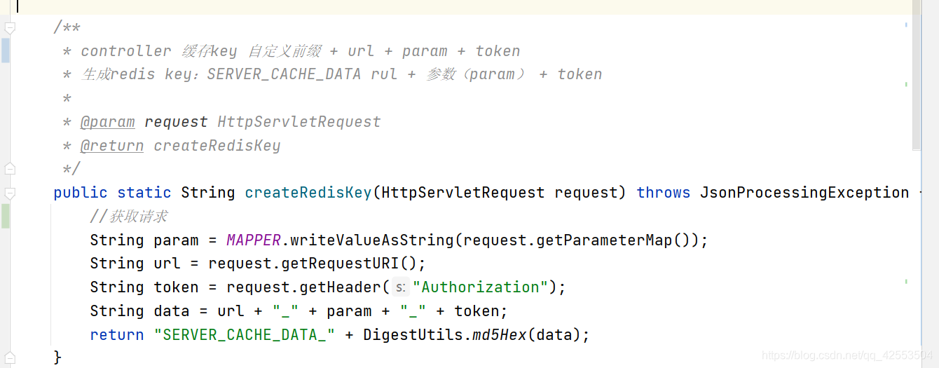 /*** controller 缓存key 自定义前缀 + url + param + token* 生成redis key:SERVER_CACHE_DATA rul + 参数(param) + token** @param request HttpServletRequest* @return createRedisKey*/public static String createRedisKey(HttpServletRequest request) throws JsonProcessingException {//获取请求参数String param = MAPPER.writeValueAsString(request.getParameterMap());//获得请求URiString uri = request.getRequestURI();//获得用户tokenString token = request.getHeader("Authorization");String data = uri + "_" + param + "_" + token;return "SERVER_CACHE_DATA_" + DigestUtils.md5Hex(data);}