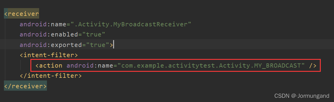 不必对另一个接收器 MyReceiver 进行更改,此时就已达到了只有 MyBroadcastReceiver 能收到广播,而 MyReceiver 不能收到广播的目的。