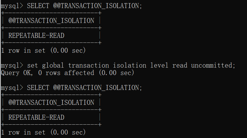 mysql> SELECT @@TRANSACTION_ISOLATION;