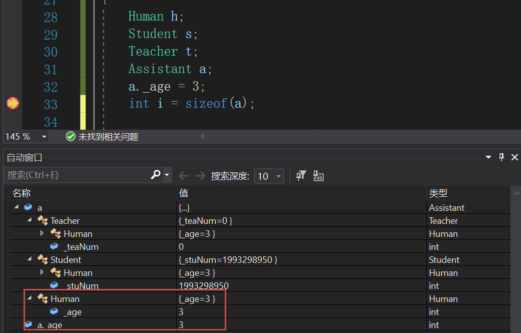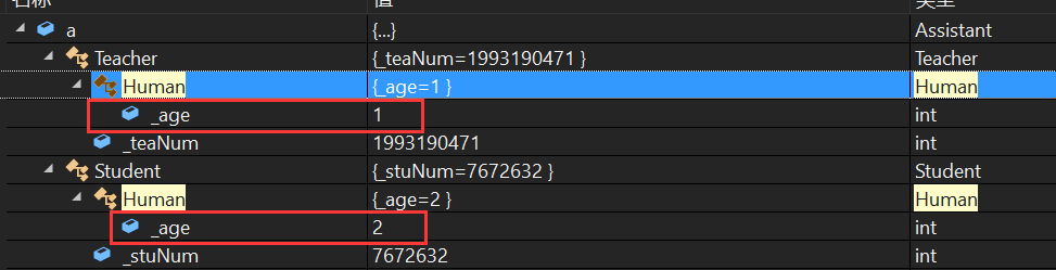 这里的 Teacher 和 Student 都从 Human 中继承了相同的成员 _age 。但是 Assistant 再从 Teacher 和 Student 继承时,就分别把这两个 _age 都给继承了过来。
