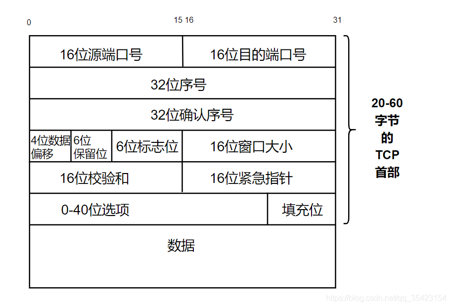 TCP头部有多少个32bit(4字节)。因为4位最大能表示15(24 -1)个,所以 TCP头部最长是60字节。 - 6位保留位: 保留为今后使用,一般设置为