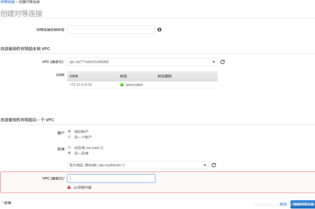 这里分别填写自己的VPC和对方的VPC的ID信息,然后在对方的VPC里就能看到有连接请求,在对方的连接请求里选择 “操作”->接受。