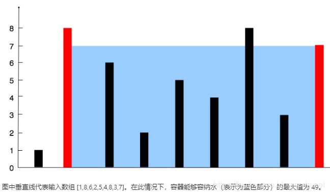 给定 n 个非负整数 a1,a2,...,an,每个数代表坐标中的一个点 (i, ai) 。在坐标内画 n 条垂直线,垂直线 i 的两个端点分别为 (i, ai) 和 (i, 0)。找出其中的两条线,使得它们与 x 轴共同构成的容器可以容纳最多的水。