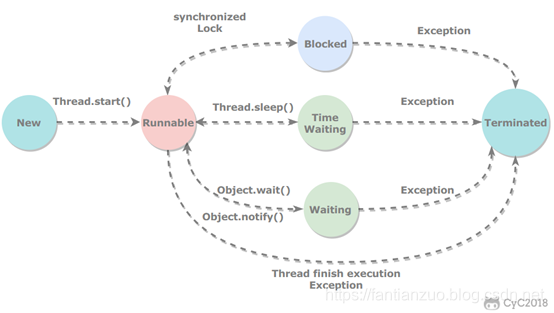 线程生命周期(五个状态):新建、就绪、运行、阻塞、死亡