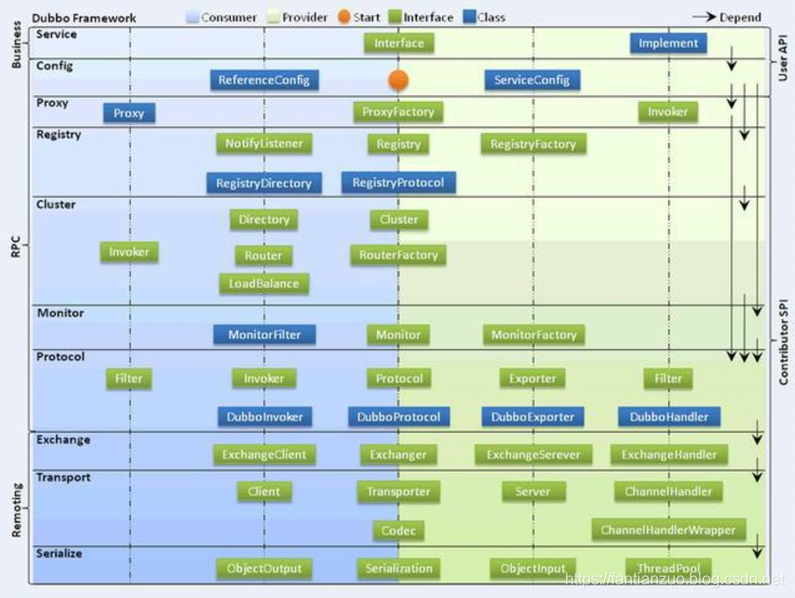 . 服务代理层(Proxy):服务接口透明代理,生成服务的客户端 Stub和服务器端 Skeleton。