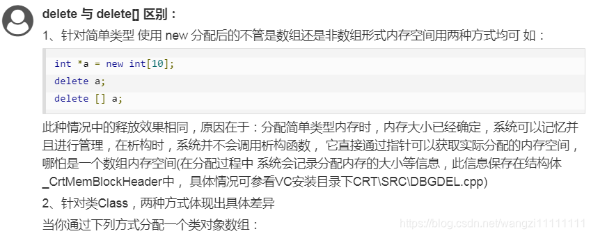 A *a = new A[10];// 仅释放了a指针指向的全部内存空间 但是只调用了a[0]对象的析构函数 剩下的从a[1]到a[9]这9个用户自行分配的m_cBuffer对应内存空间将不能释放 从而造成内存泄漏