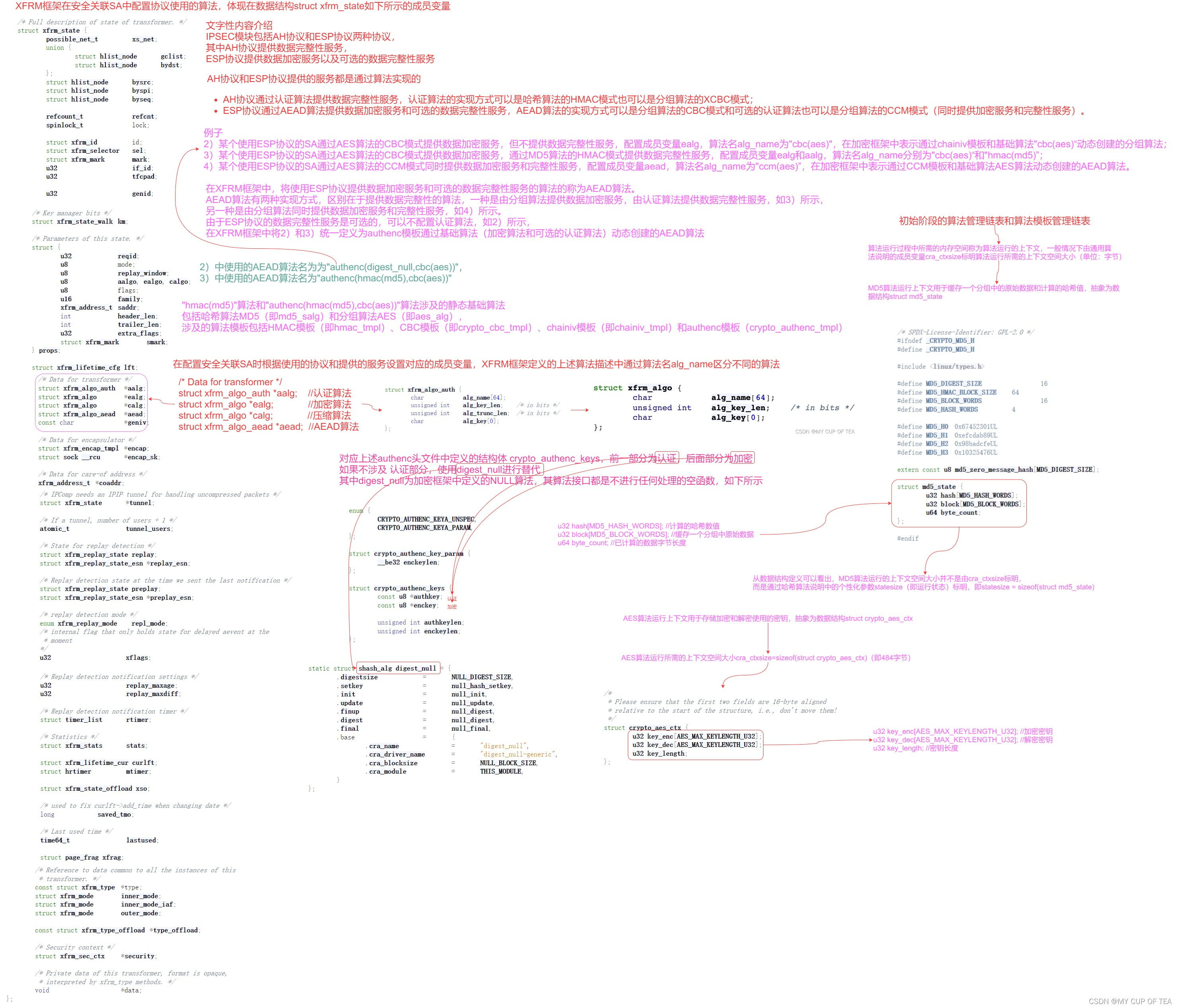 - 本节将分别介绍使用"hmac(md5)"算法的AH协议和"authenc(hmac(md5),cbc(aes))"算法的ESP协议的服务流程,包括如何创建算法实例以及如何提供服务。