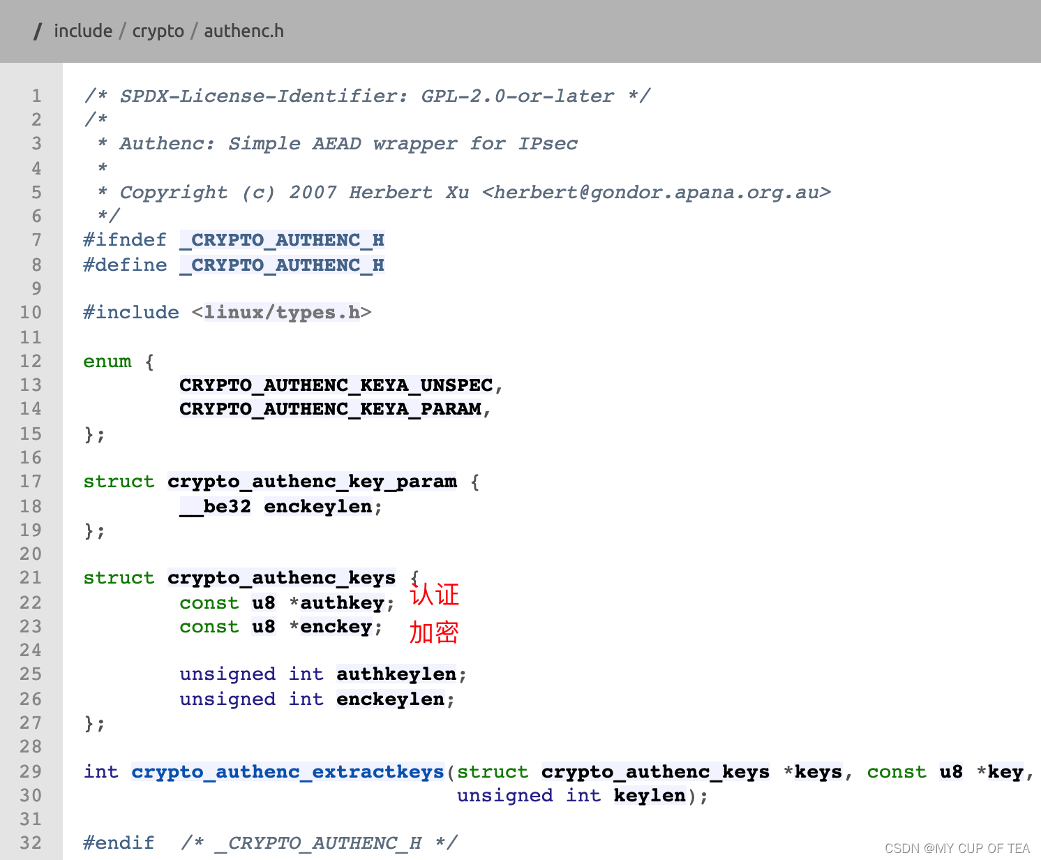 - 对应上述authenc头文件中定义的结构体 crypto_authenc_keys,前一部分为认证,后面部分为加密。