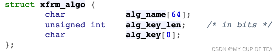 - XFRM框架在安全关联SA中配置协议使用的算法,体现在数据结构struct xfrm_state如下所示的成员变量。