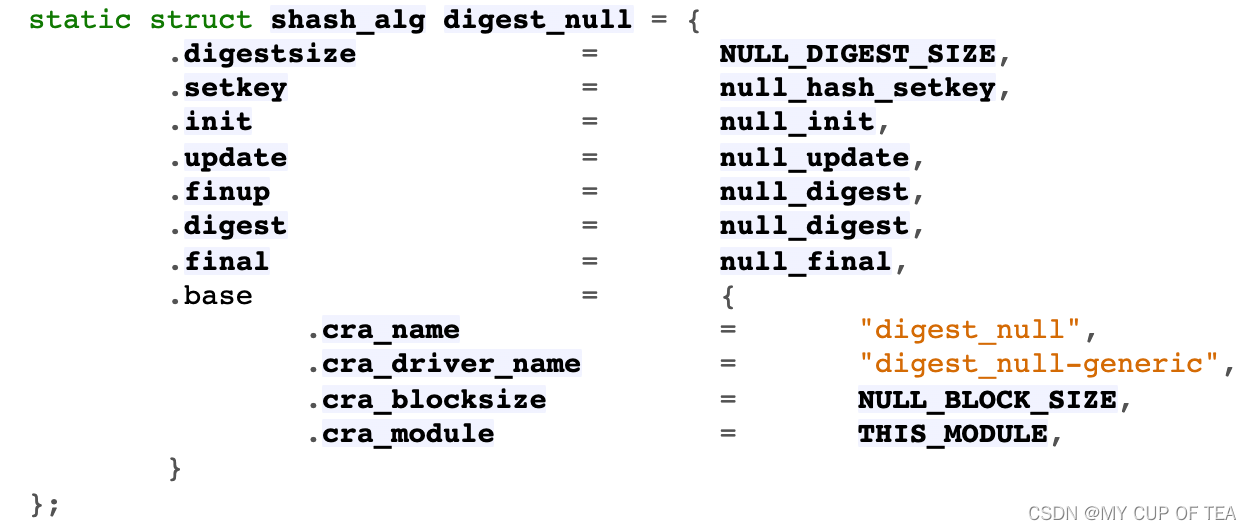 - 其中digest_null为加密框架中定义的NULL算法,其算法接口都是不进行任何处理的空函数,如下所示。