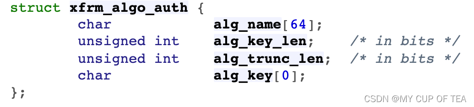 /* Data for transformer */struct xfrm_algo_auth	*aalg;   //认证算法struct xfrm_algo	*ealg;       //加密算法struct xfrm_algo	*calg;       //压缩算法struct xfrm_algo_aead	*aead;   //AEAD算法- 在配置安全关联SA时根据使用的协议和提供的服务设置对应的成员变量,XFRM框架定义的上述算法描述中通过算法名alg_name区分不同的算法,例如: