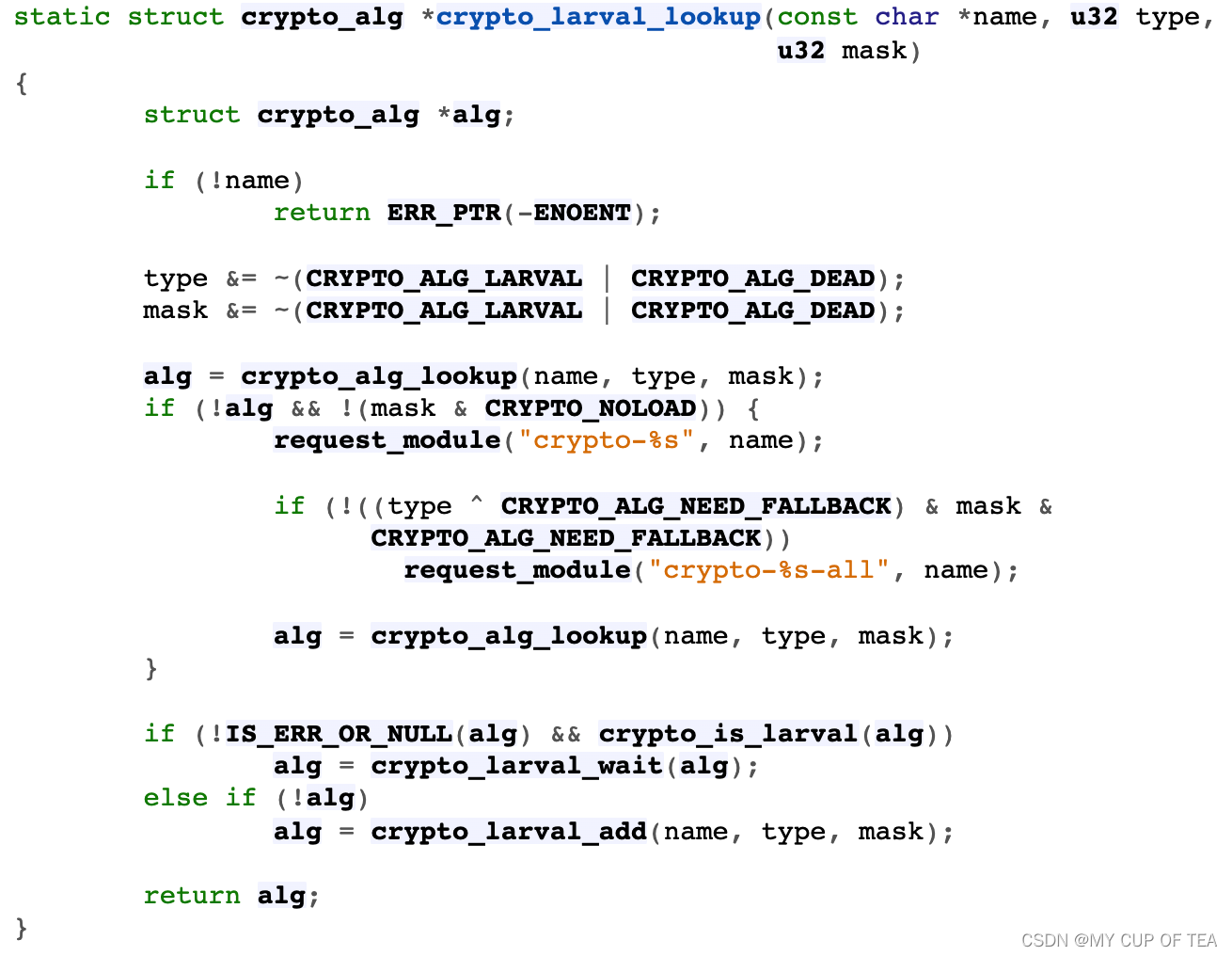 - 2)算法查找流程由函数crypto_alg_lookup实现,返回值为空说明未查找到符合的算法,否则为查找到符合条件的算法(可能是算法幼虫)。