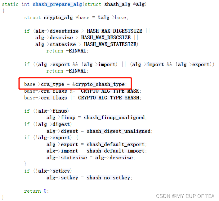 - 函数shash_prepare_alg中最重要的一点是设置了通用算法说明中的成员变量cra_type,(这一步具体是在 shash_prepare_alg函数中设定的)设置为crypto_shash_type,这样外部应用就可以访问到已注册的哈希算法了。