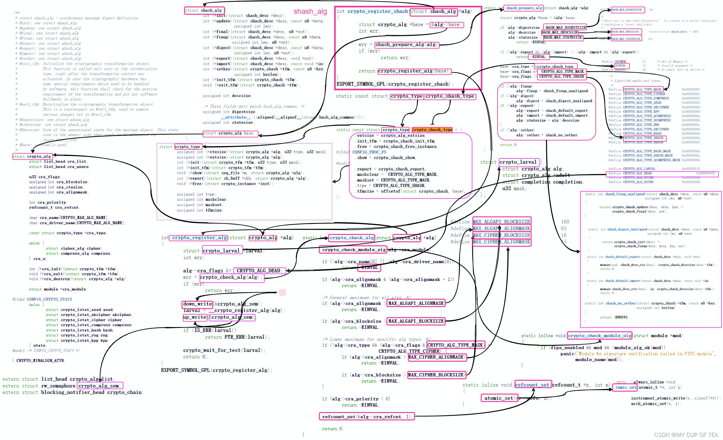 - 2)准备工作完成后,静态哈希算法的注册流程也是由静态算法注册函数crypto_register_alg完成,注意的是crypto_register_shash函数的输入参数为哈希算法说明alg,而调用crypto_register_alg函数时的输入参数为哈希算法说明对应的通用算法说明base(=&alg->base)。