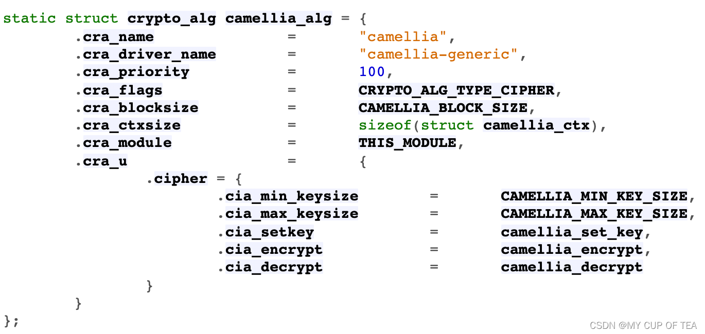 - 加密框架支持Camellia算法,记为camellia,其实现源码为camellia.c。