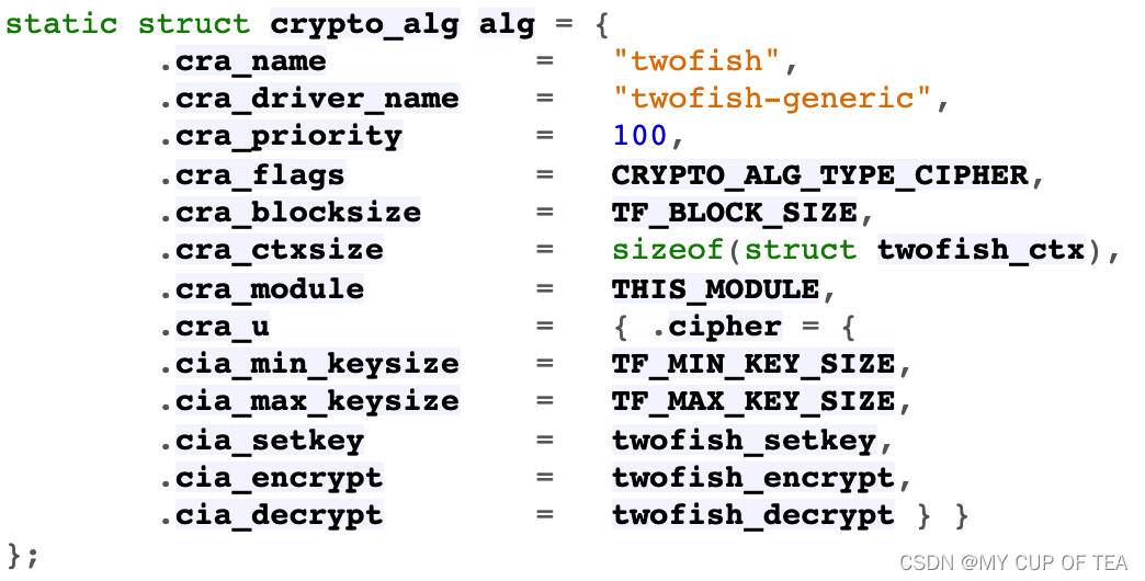 - 加密框架支持Twofish算法,记为twofish,其实现源码为twofish_generic.c和twofish_common.c。