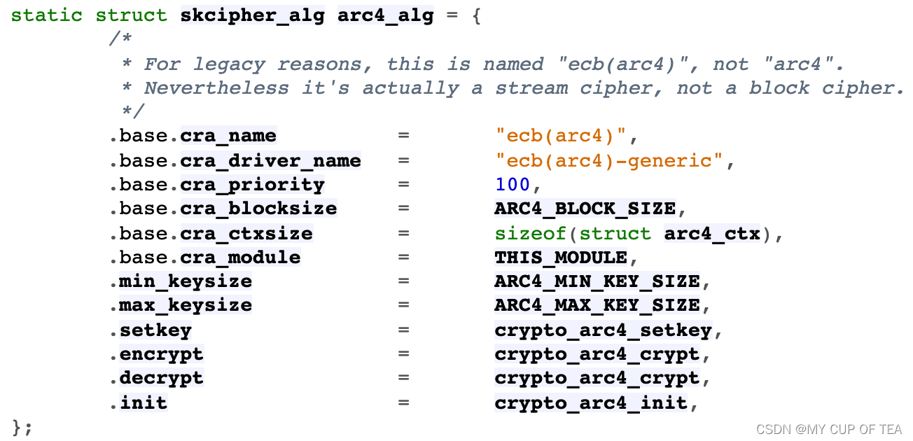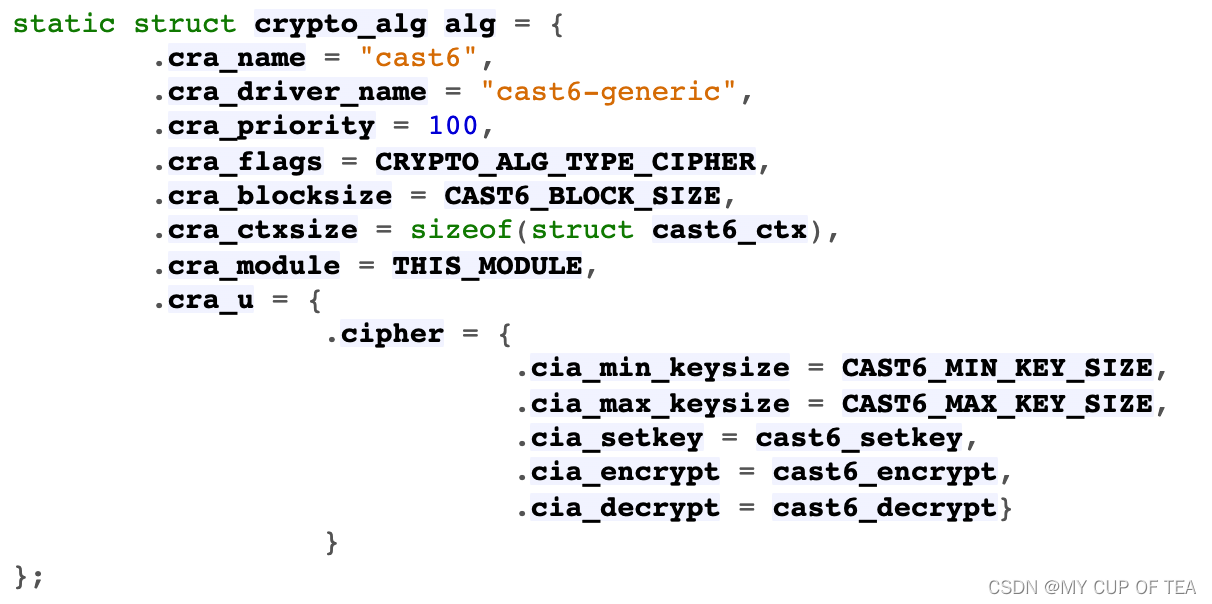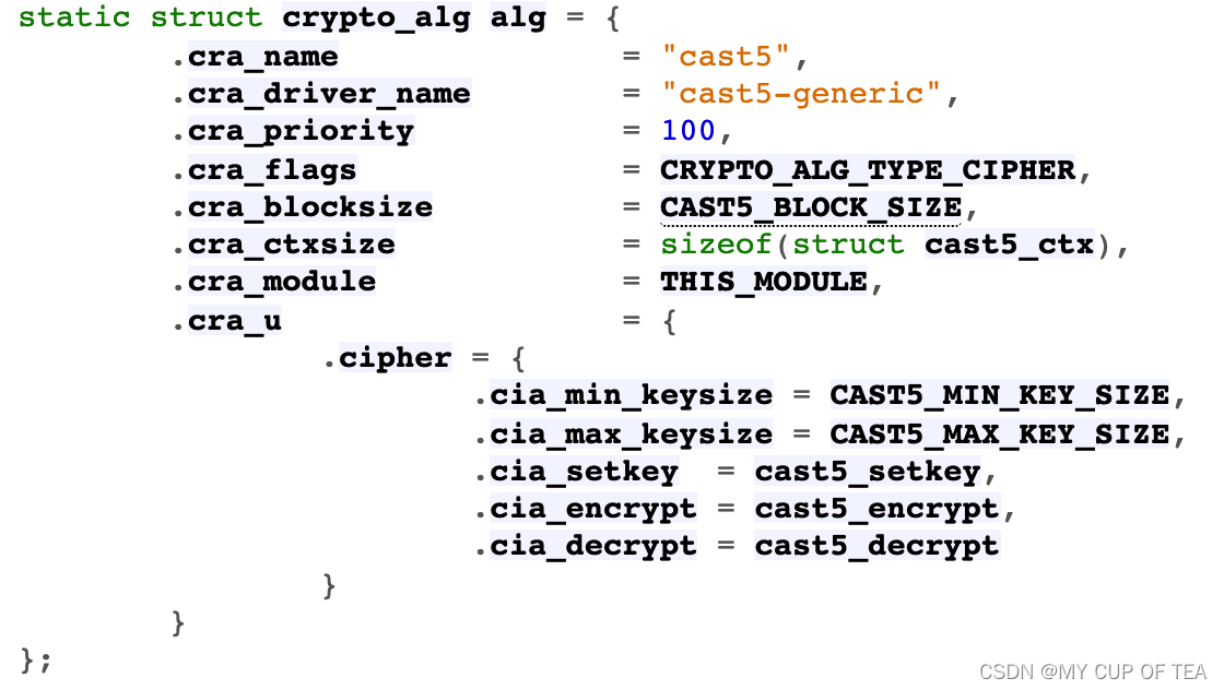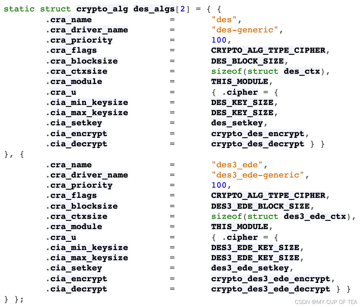 - 加密框架支持DES算法和3DES算法,记为des和3des_ede,实现源码为des_generic.c。
