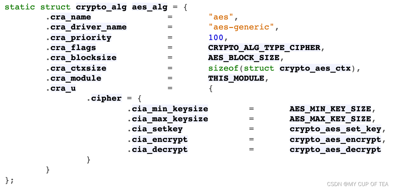 - 加密框架支持AES算法,记为aes,实现源码为aes_generic.c。