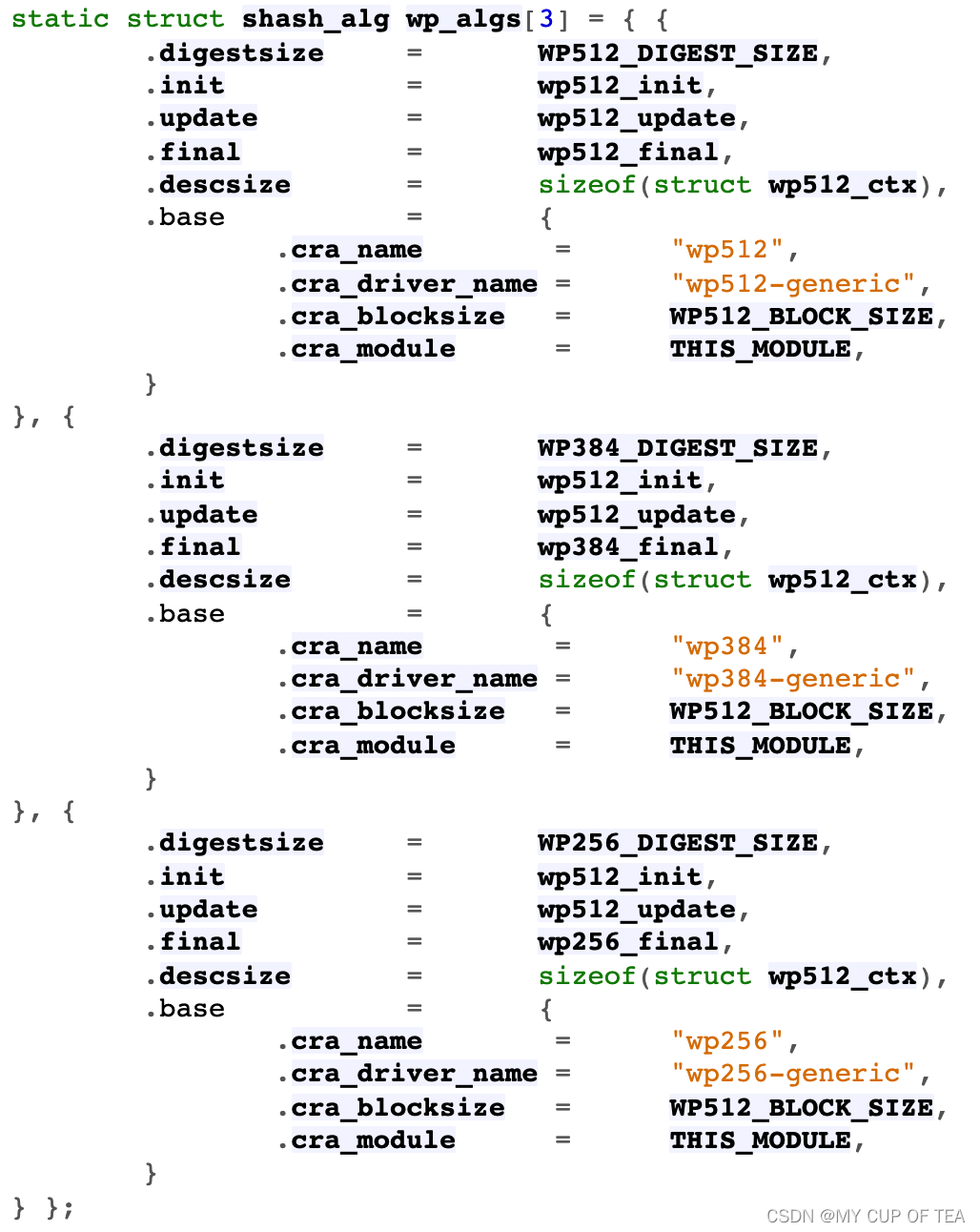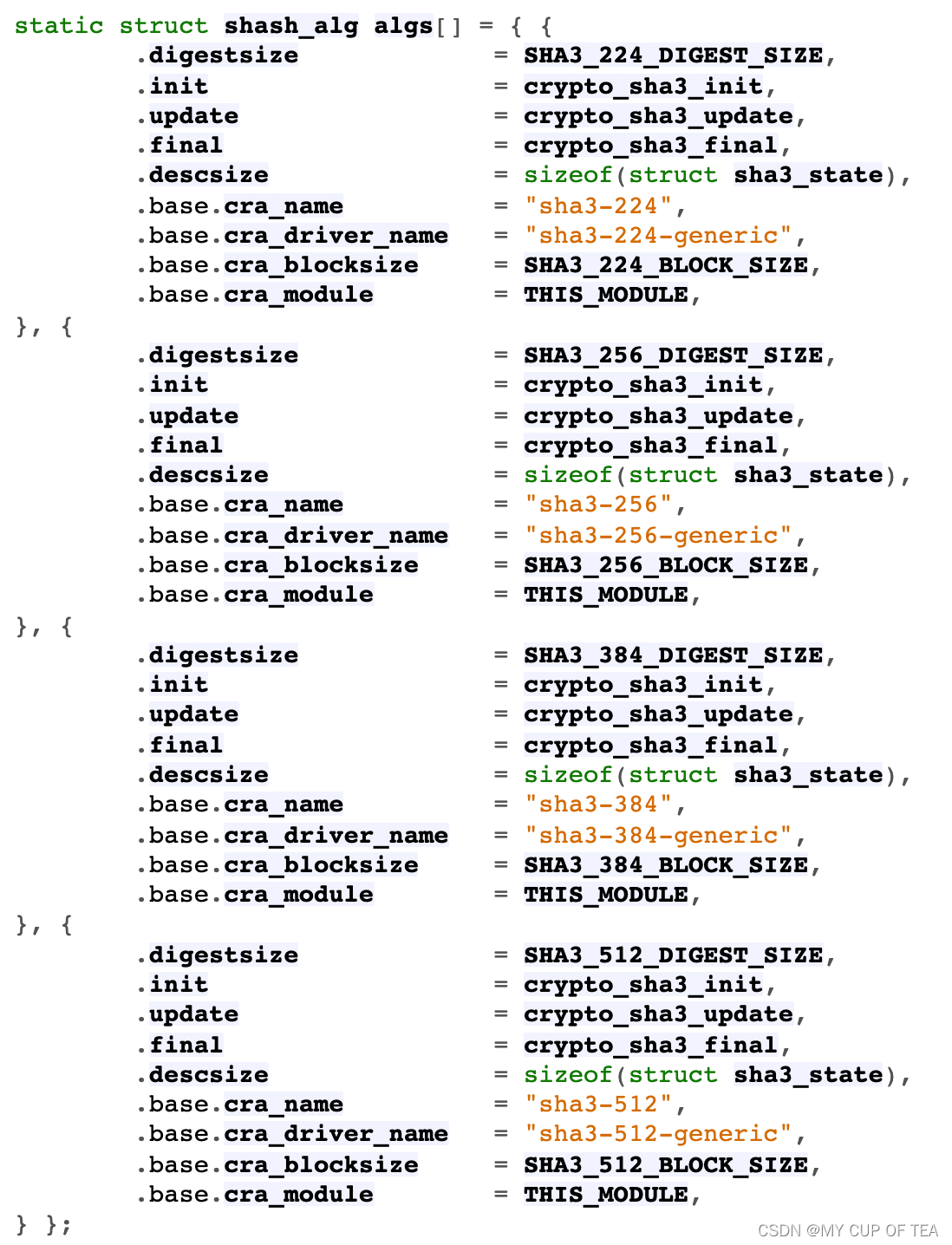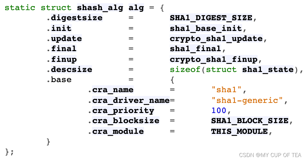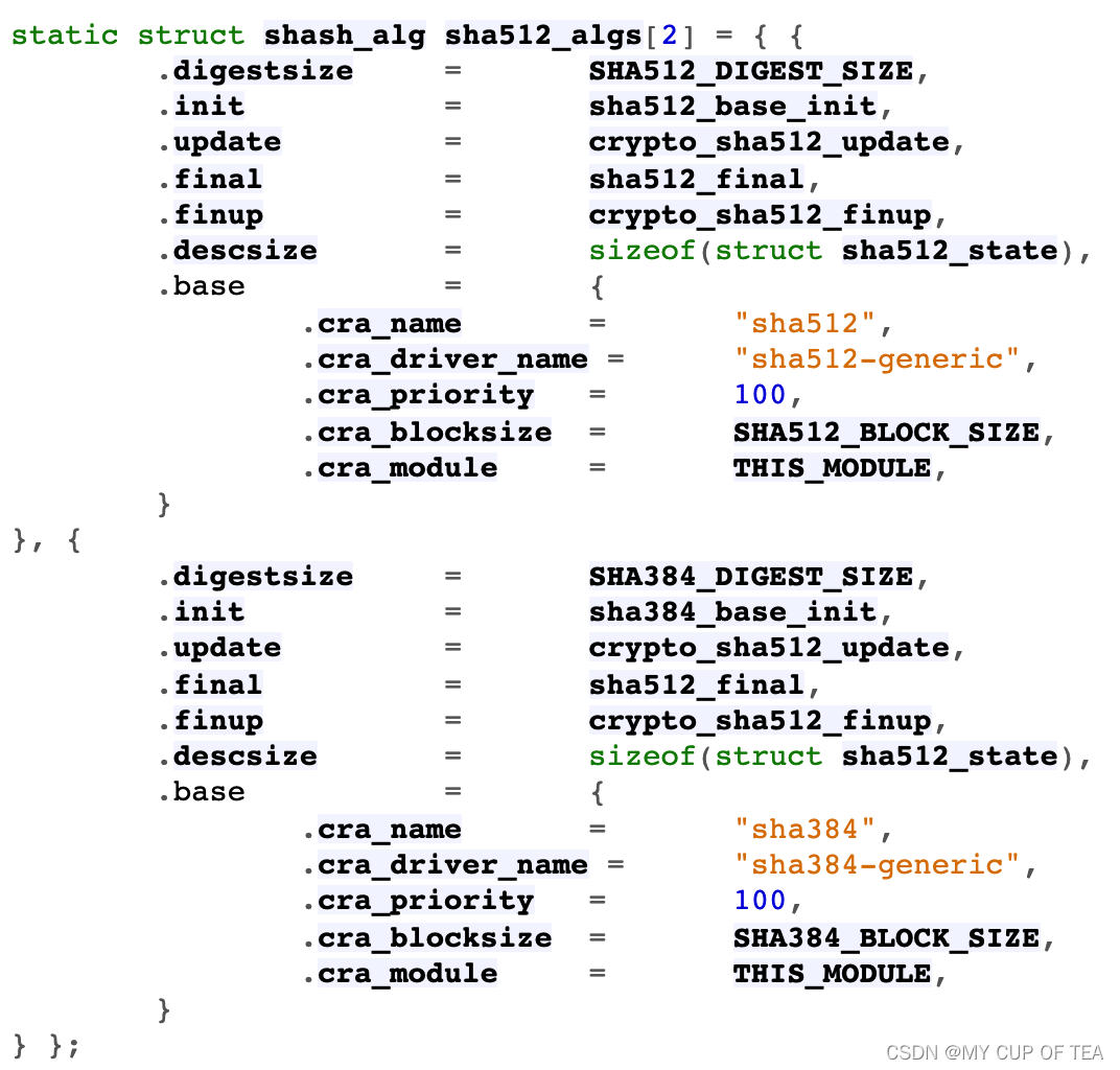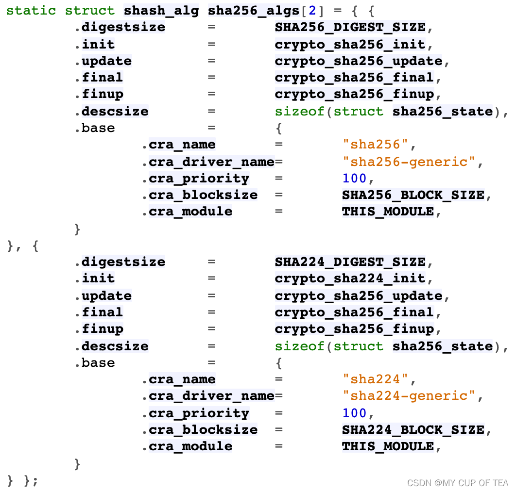 - 加密框架支持SHA系列算法中的SHA1、SHA224和SHA256以及SHA384和SHA512,分别记为sha1、sha224和sha256以及sha384和sha512,其实现源码sha1_generic.c、sha256_generic.c和sha512_generic.c。
