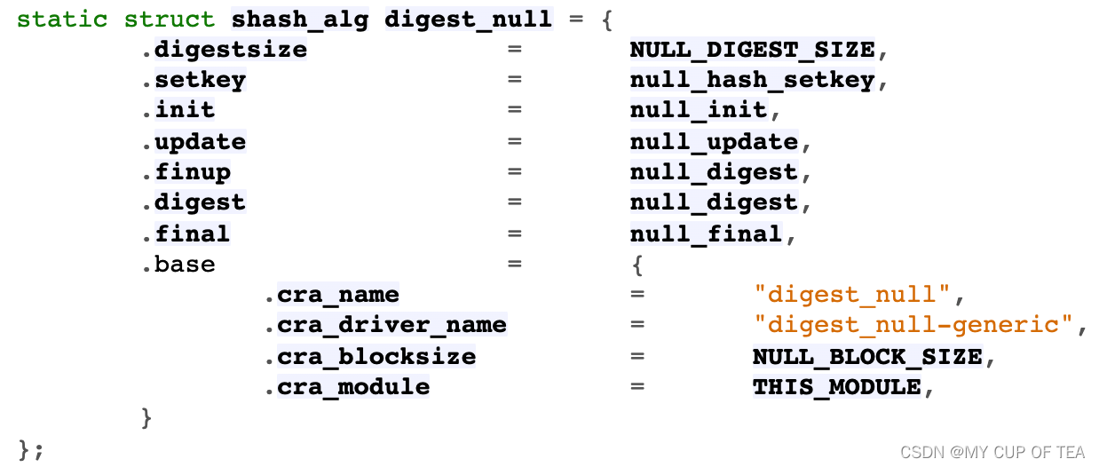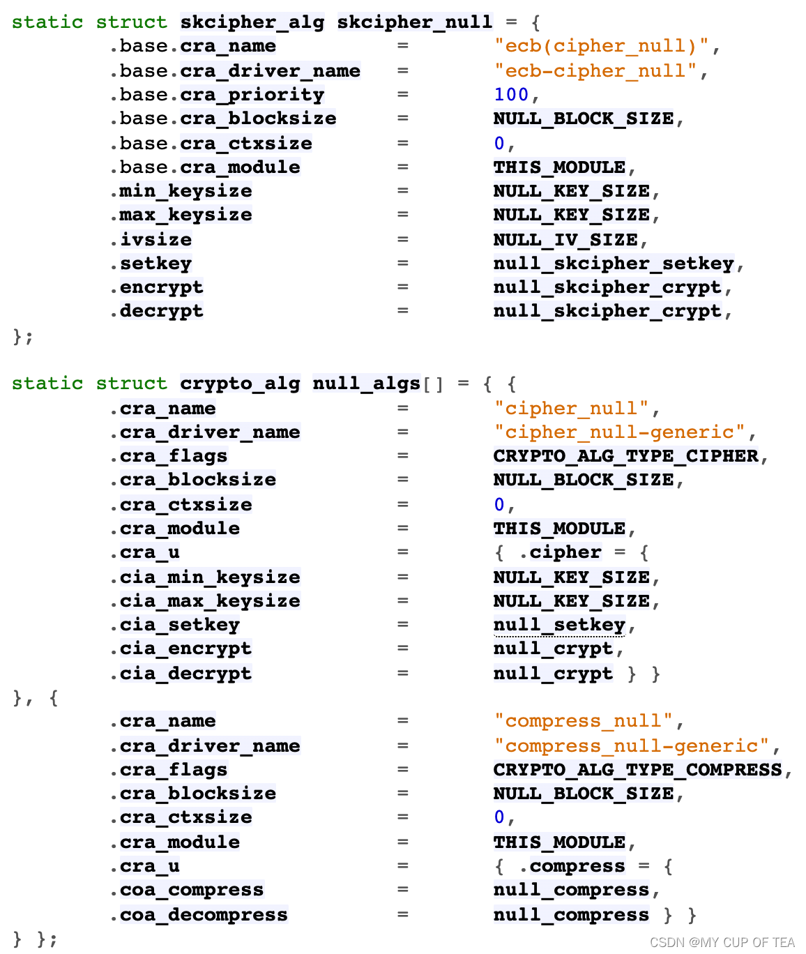 - 除上述常规算法外,加密框架还支持一种特殊的算法,即什么都不做的NULL算法。NULL算法的实现源码为crypto_null.c,其中定义了名为digest_null、cipher_null和compress_null三种NULL算法,即NULL摘要算法、NULL加密算法和NULL压缩算法