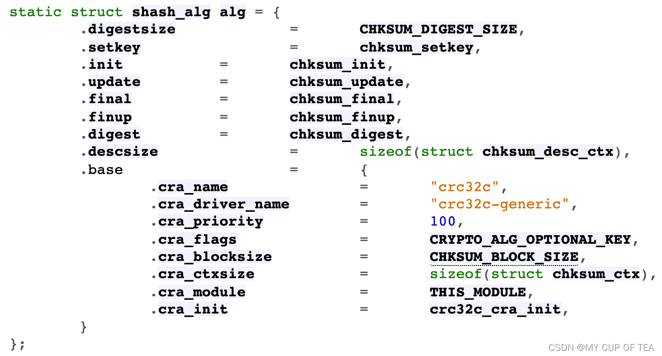 - 加密框架支持的CRC算法是CRC32,即数据校验值为32位,记为crc32c,其实现源码为crc32c.c。